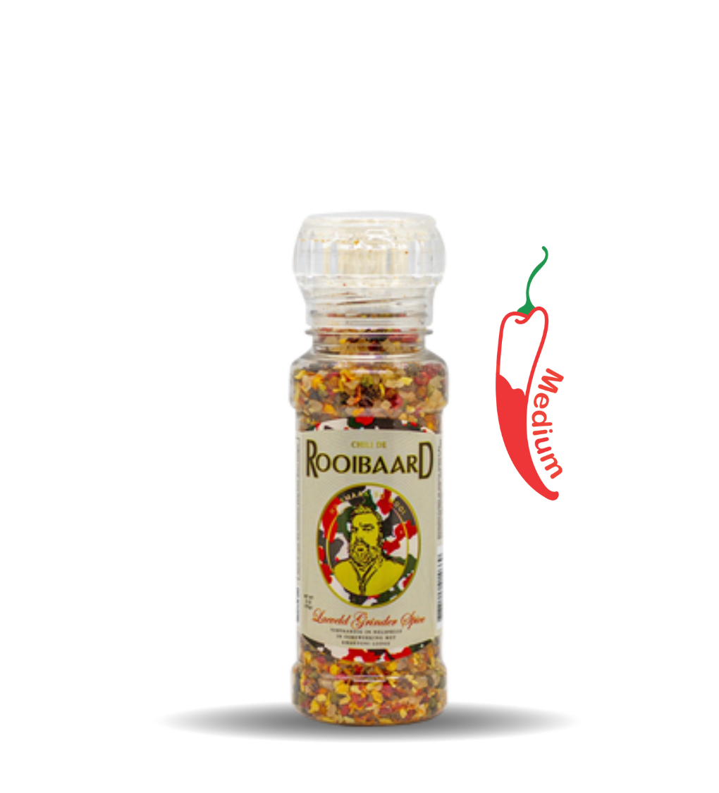 Rooibaard®️ Grinder Spice - 'n heerlike kombinasie mengsel van knoffelvlokkies, en vyf verskillende peperkorrels. Perfek om jou vleis te geur.
